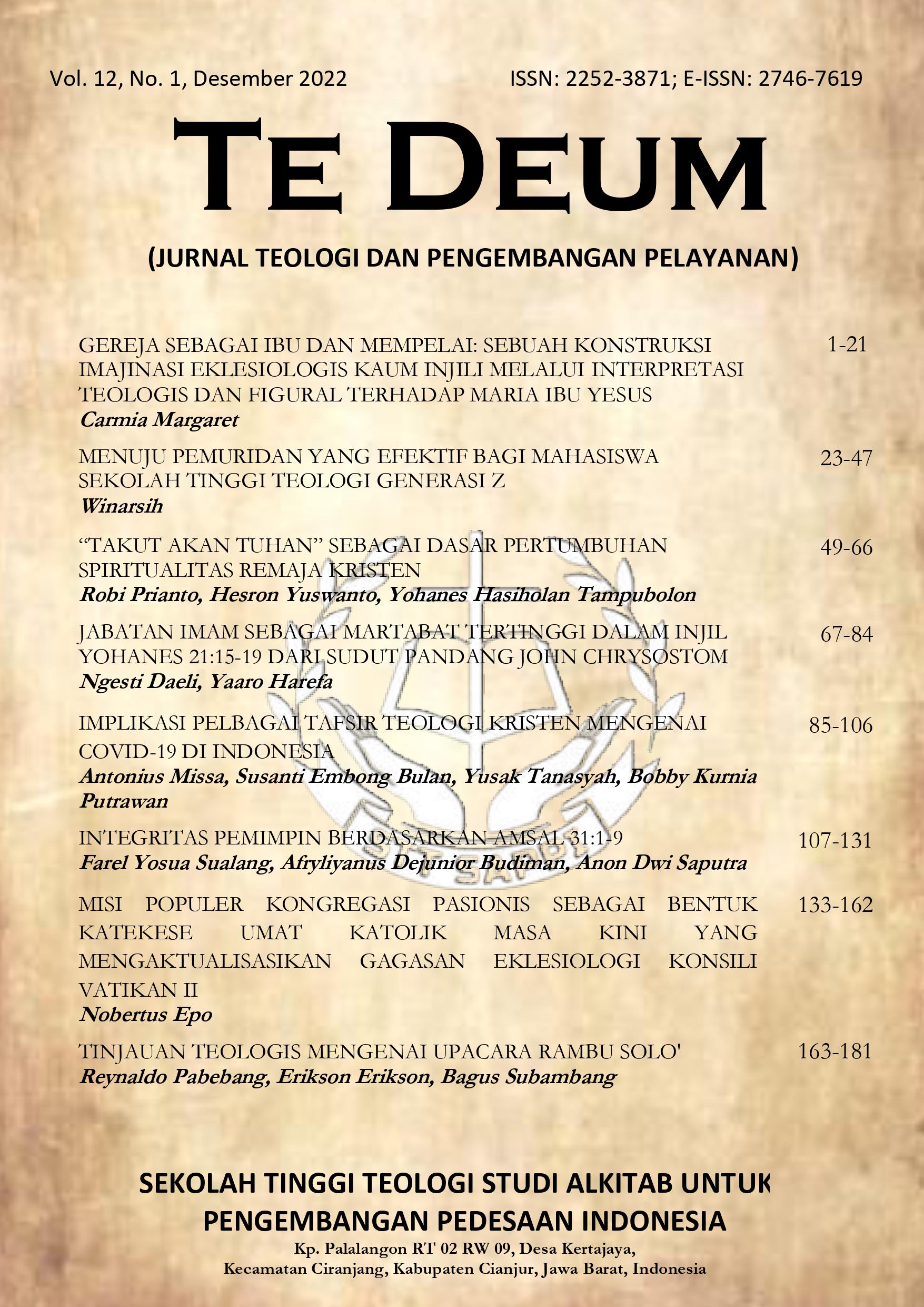 Pada terbitan Te Deum (Jurnal Teologi dan Pengembangan Pelayanan) kali ini menetapkan Tema: "Teologi dan Transformasi Sosial: Menjawab Tantangan Gereja di Era Modern"